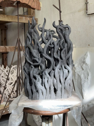 Je vais donc réaliser une cabane tissée en osier vivant, dont la base sera composée de 4 colonnes modelées en grès local (1m40 chacune) et cuites dans un four a bois à La Borne.